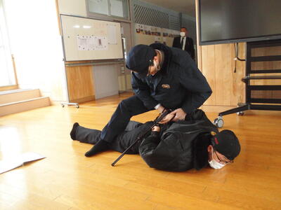 紋別警察署の方々にお世話になり、警察官の方に不審者役を演じていただき、