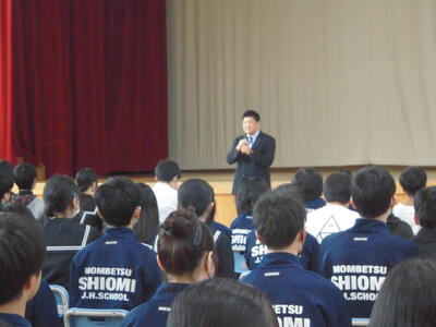 その後体育館に集まり、紋別警察署の方からご講話をいただきました。